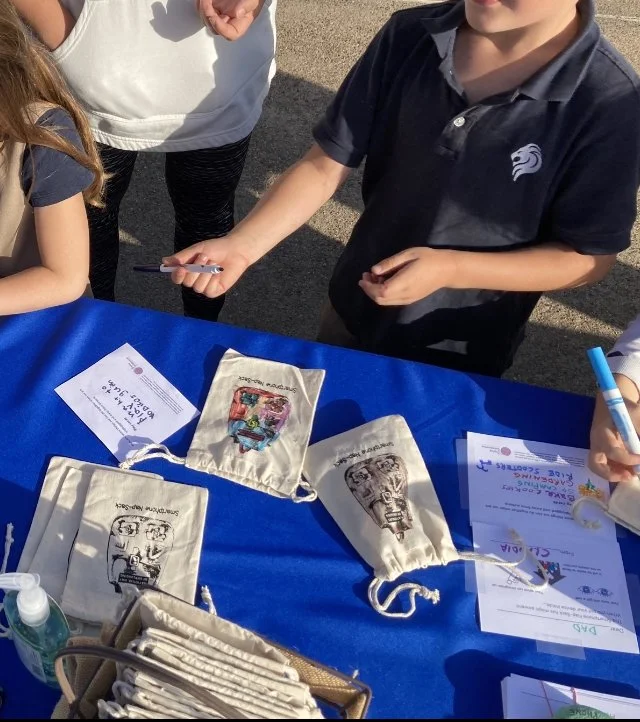 Elementary students decorate smartphone nap-sacks and gift cards.