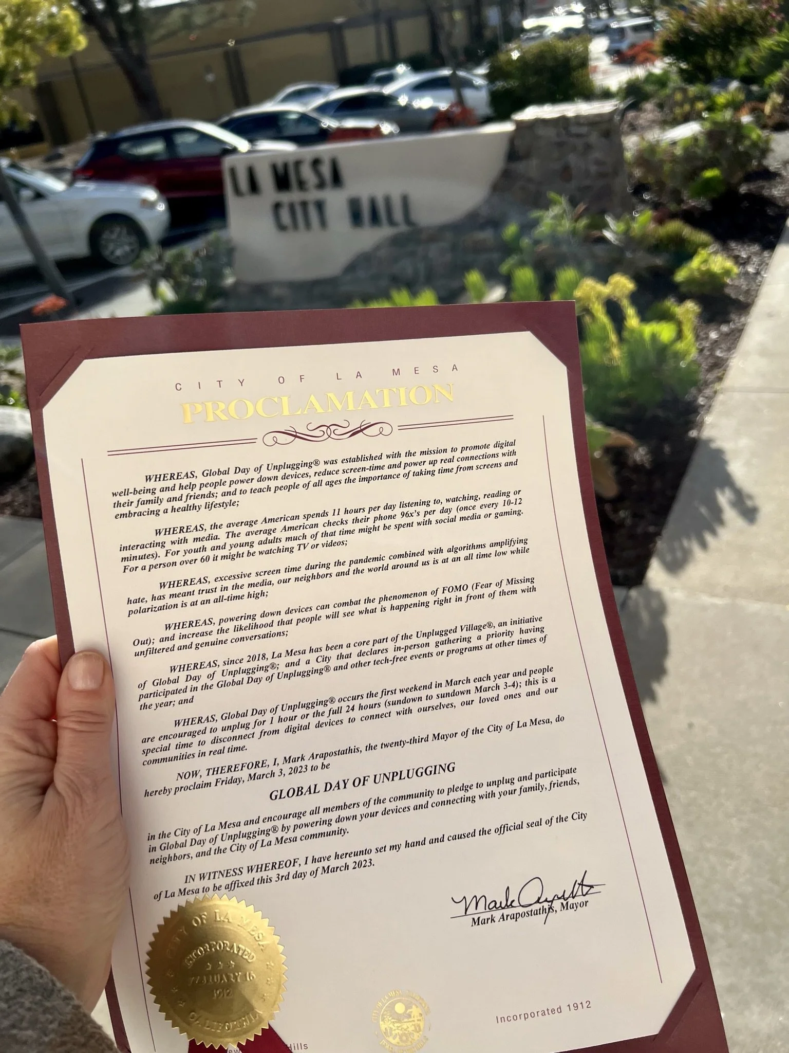 You might want to approach your local City Council to garner community support. Ask them to do a Proclamation for the Global Day of Unplugging (always the first weekend in March- sundown on Fri to sundown on Saturday) or for turning your community into an Unplugged Village®. Brainstorm with your team to see who else you might enlist for support. City Counsels are often eager to be helpful in their community! You may want to explore service organizations like the Lions Club, Rotary, Kiwanis, or Soroptimists to see if they might want to join forces. Check out faith based organizations where they have youth groups or outreach to youth or the community. Consider partnering with neighborhood groups, playgroups/mommy and me or nature groups. Ask people to download and take a photo with the “I UNPLUG/WE UNPLUG” signs. They are available in several languages and businesses can add their logo and post it to social media or use it for emails/newsletters. Please share any photos (event or pre-event) with us HERE.